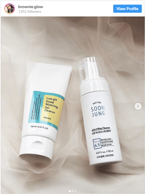 — Credit by @brownie.glow (Featured products: COSRX’s Low pH Good Morning Gel Cleanser and Etude House's Soon Jung pH 6.5 Whip Cleanser)